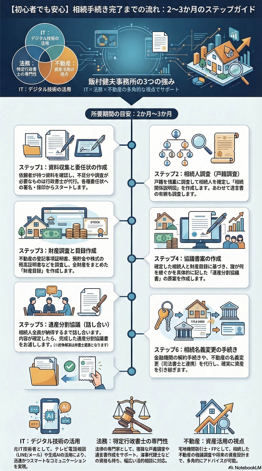 弊所の強みは、単なる法律相談に留まりません。宅地建物取引士としての不動産の視点、ファイナンシャルプランナーとしての資産設計の視点、そしてIT技術者としての効率的なサポートを組み合わせ、一つの窓口でトータルな解決策をご提案できることです。難しい専門用語は使いません。身近なパートナーとして、どうぞお気軽にご相談ください。